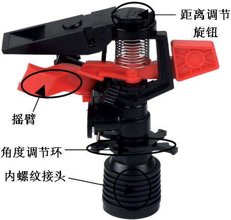 1.摇臂、转轴,保证喷头运转平稳,震动小,更耐化肥和农药腐蚀。