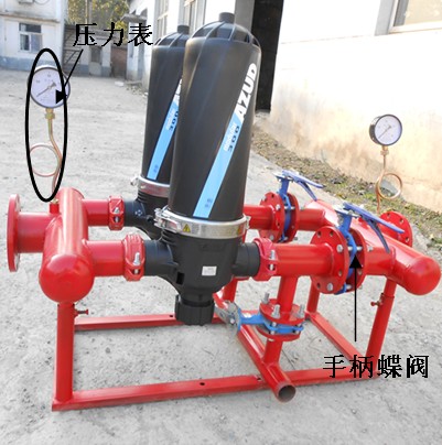 叠片手动反冲洗组合系统,通过对控制阀门的开闭,可以实现过滤器的过滤和反冲洗功能。