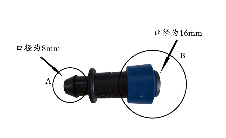 3.将滴灌带一端用剪刀剪平整,套在管件 B 端,要保证滴灌带要在蓝色拉环以内。